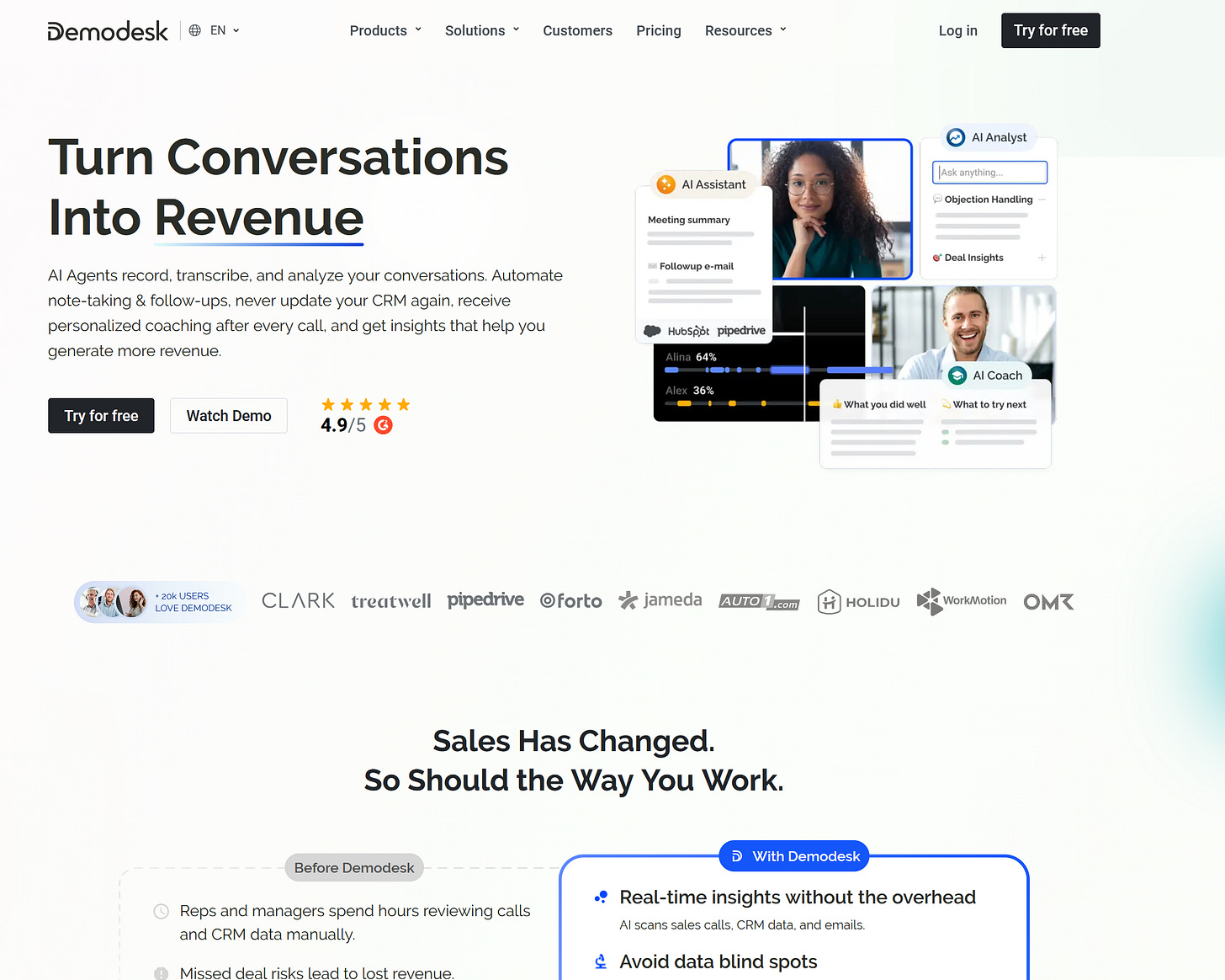 Demodesk builds AI sales agents that record, transcribe, and analyze conversations so reps and managers can stop living in call recordings and CRM updates, and start focusing on coaching, deals, and strategy. AI scans sales calls, CRM data, and emails to surface trends in objections, win rates, and customer sentiment, while GDPR‑compliant controls govern what gets recorded, who can see it, and how it’s used.