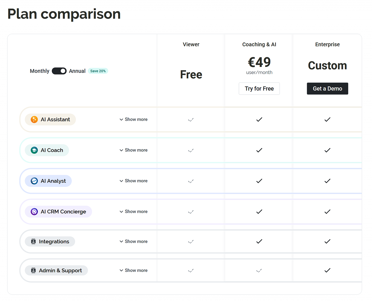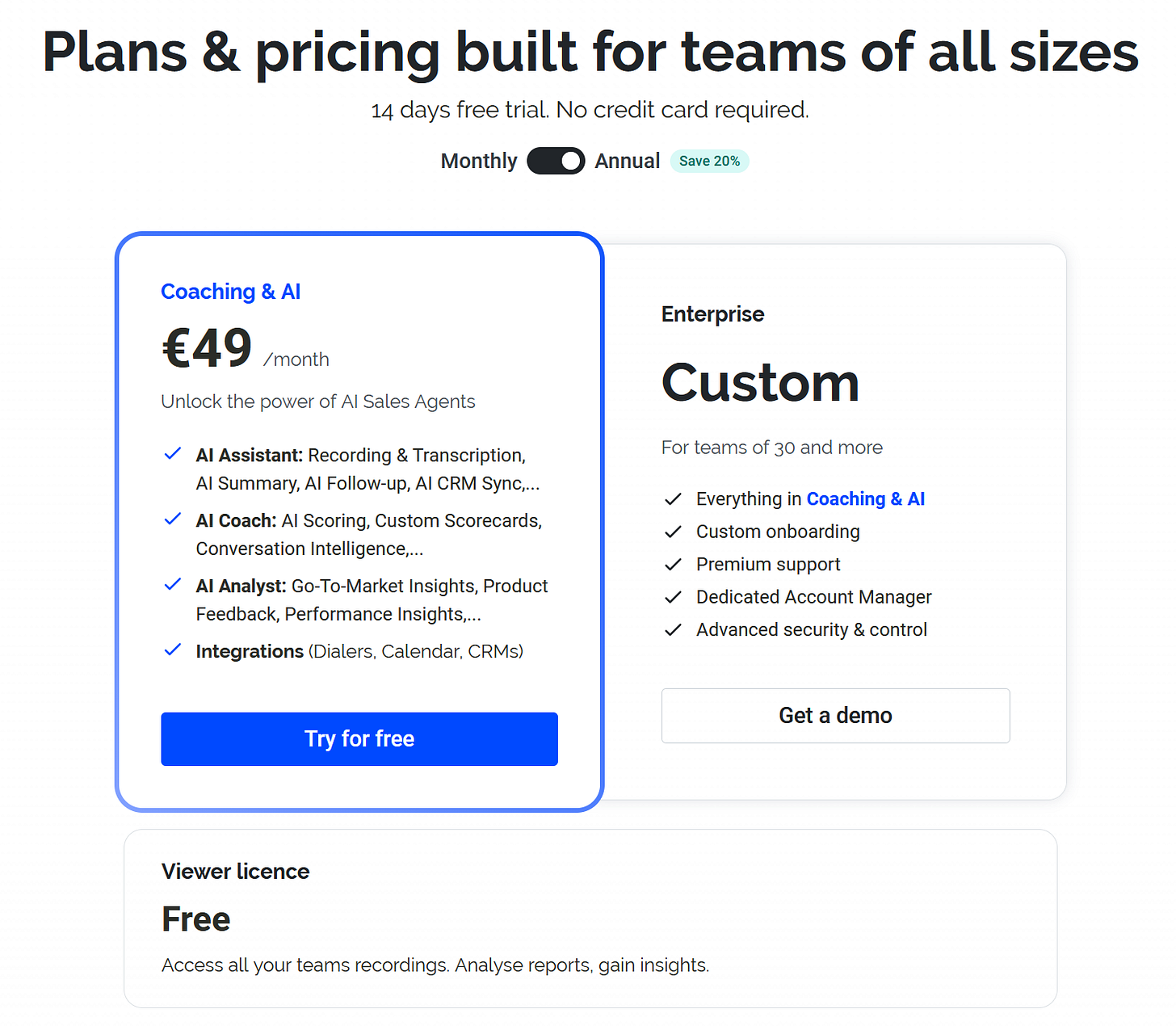This is exactly the kind of structure mid‑market buyers say they want when they’re trying to avoid Gong‑style complexity: a clean per‑seat ladder, a credible “standard” tier for most users, and a free “everyone sees the truth” layer on top.