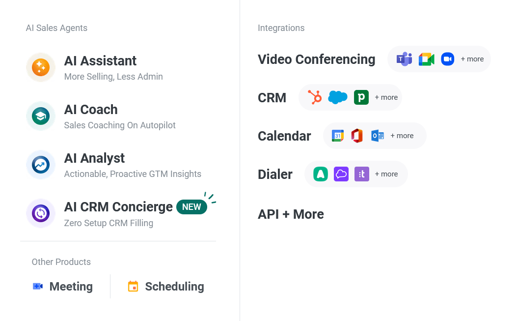 Recording, transcription/translation, AI summaries and follow‑up, AI CRM filling, coaching analytics, deal and pipeline insights, go‑to‑market, and product feedback.